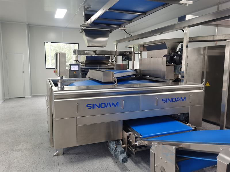 配合喂料機(jī)將軋薄的面皮切片并依次疊加至8~16層,并輸送至成型軋輥,該機(jī)能將回面始終處于面皮底部,經(jīng)切片式疊層機(jī)生產(chǎn)出來的餅干層次感強(qiáng)、口感松脆、酥化程度極高,配合機(jī)器上的撒酥機(jī),可生產(chǎn)蘇打餅干和其它高檔餅干。